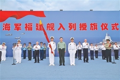 下午4时30分许,入列授旗仪式开始,全场高唱中华人民共和国国歌,五星红旗冉冉升起。仪仗礼兵护卫着八一军旗,正步行进到主席台前。习近平将八一军旗授予福建舰舰长、政治委员。福建舰舰长、政治委员向习近平敬礼,从习近平手中接过八一军旗。习近平同他们合影留念。入列授旗仪式在中国人民解放军军歌声中结束。
